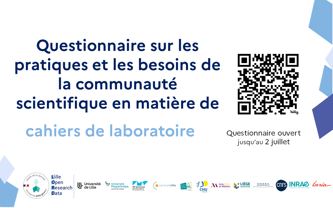 Suite à une remontée de besoins exprimés dans le cadre du réseau des correspondants données de l’atelier de la donnée LORD (Lille Open Research Data), nous menons actuellement une étude sur les pratiques et attentes en matière de cahiers de laboratoire électroniques.